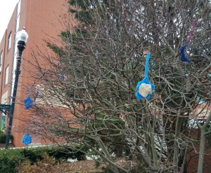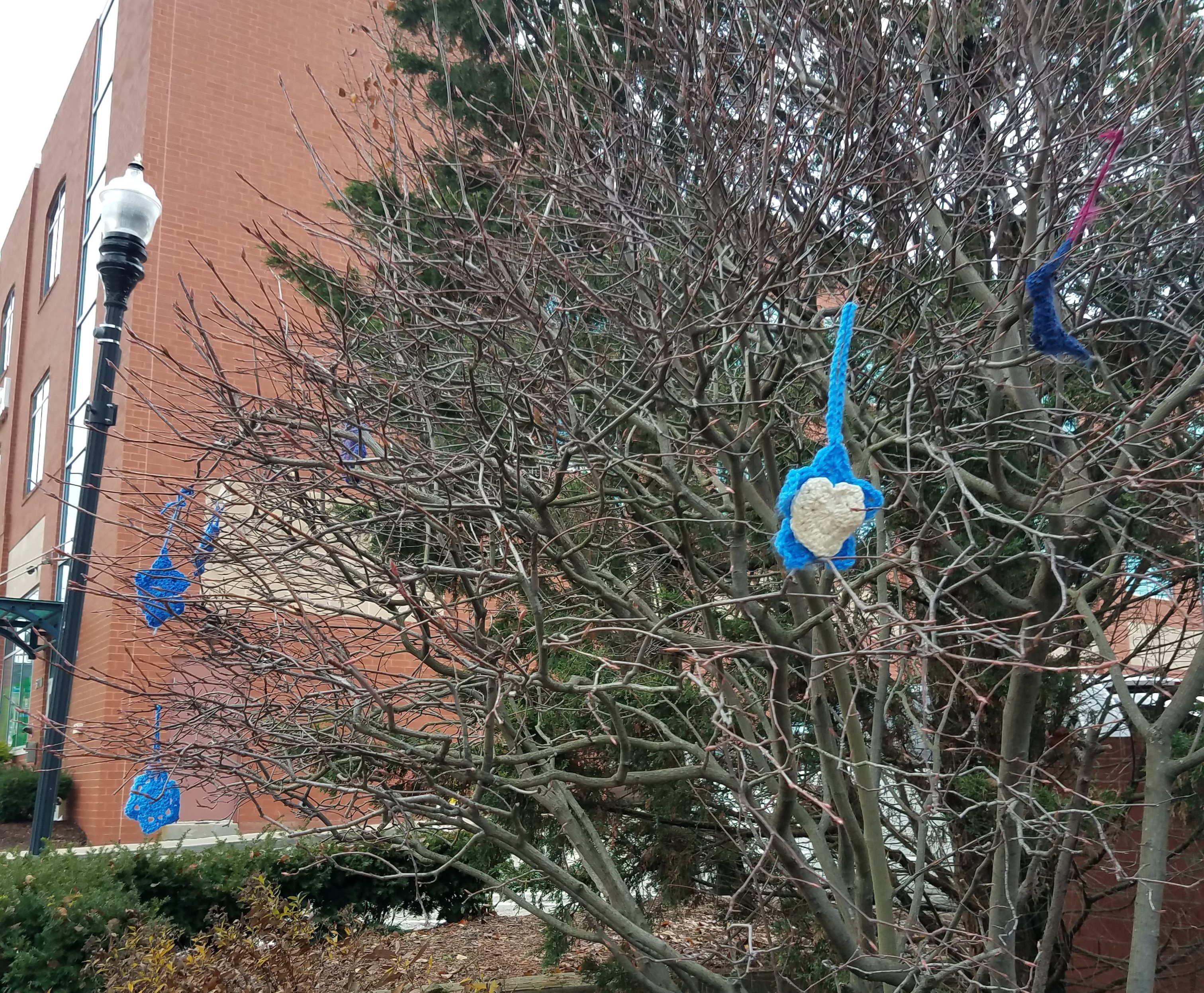 Stars of David hanging from the trees. They were made of crocheted fabric, paper, plastic…there were all kinds of beautiful stars everywhere. We saw Hanukkiahs on the street corners. In all the windows, there were all kinds of signs to show support, all over the place.